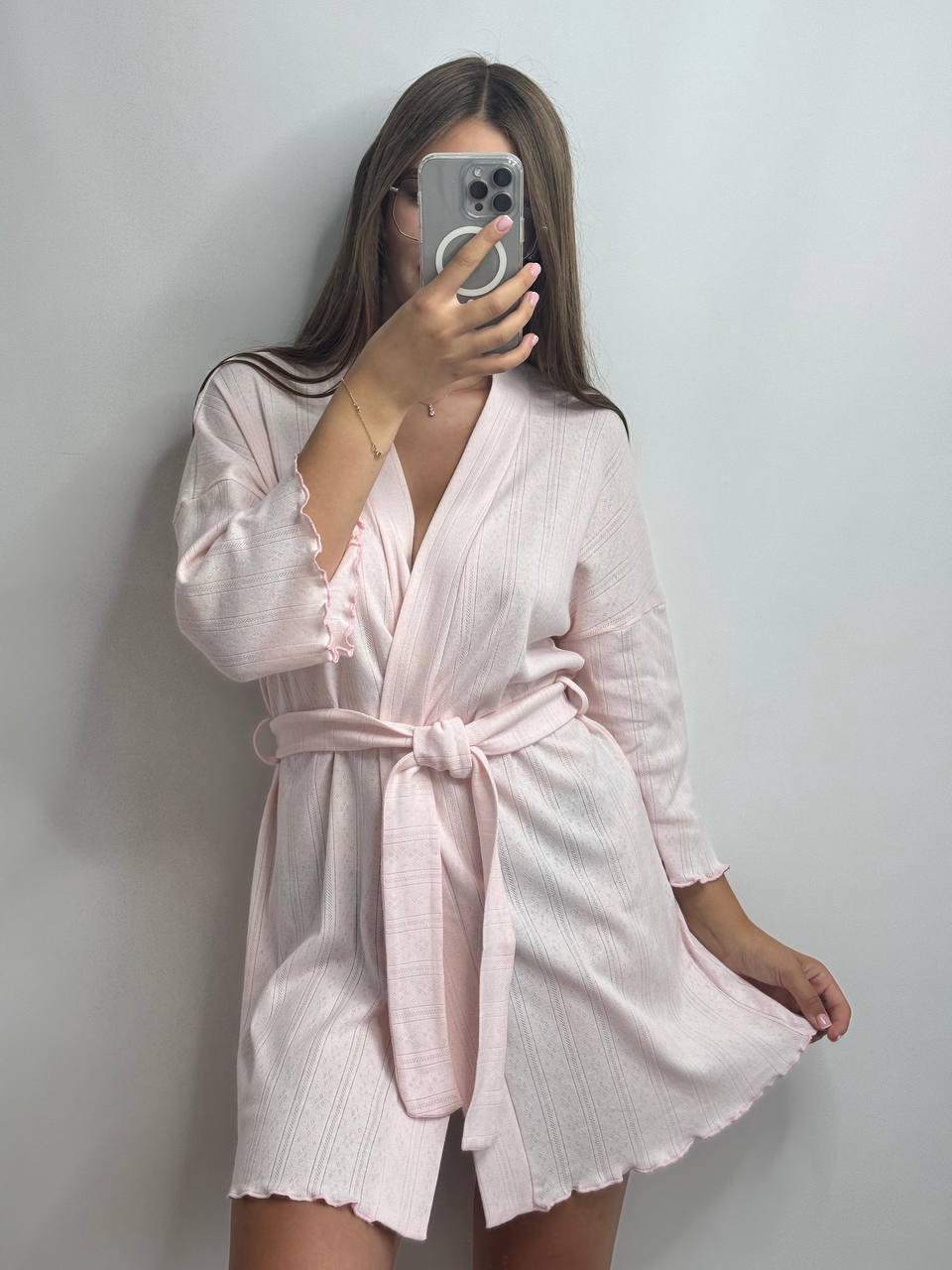 - Тканина приємна до тіла, легка та дихаюча. Завдяки фактурному плетінню халат виглядає естетично та делікатно, не перевантажуючи образ.