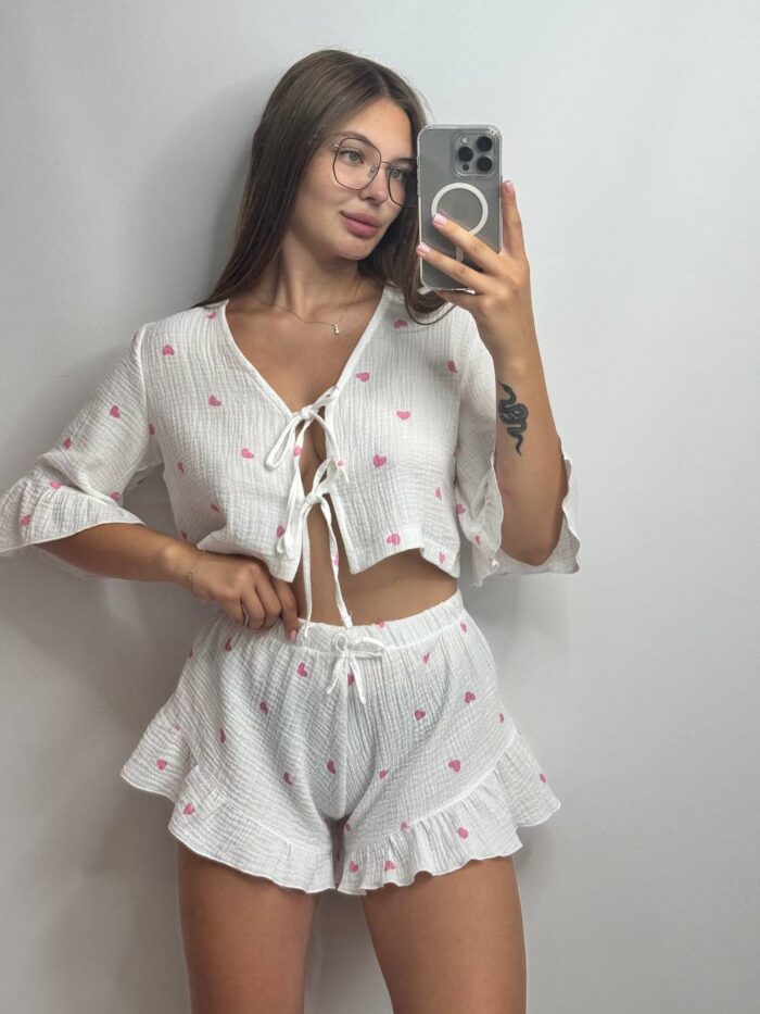 Ніжний та грайливий комплект із мусліну — це ідеальне поєднання комфорту, легкості та романтичного дизайну. Складається з короткого топа на зав’язках і вільних шортів з рюшами по низу, що створюють легкий, повітряний силует.