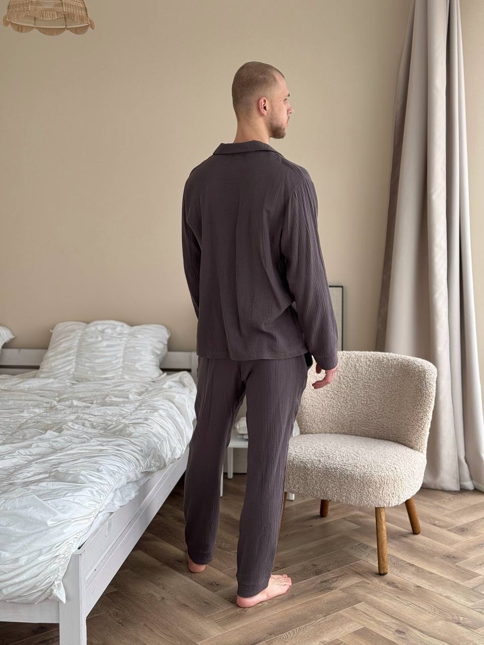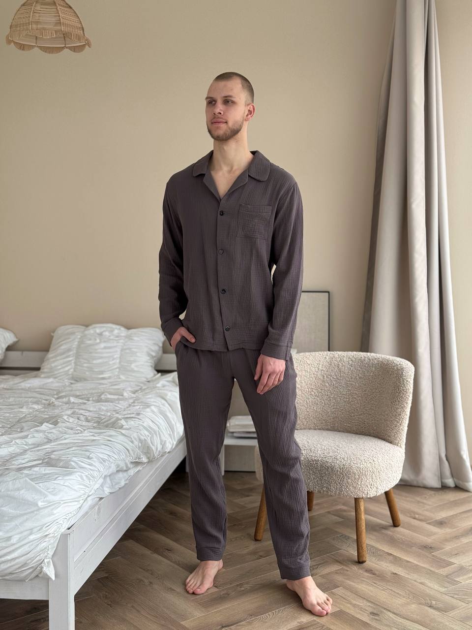 Стильний чоловічий домашній костюм з муслінової тканини на ґудзиках. Ідеально підійде для високих чоловіків.