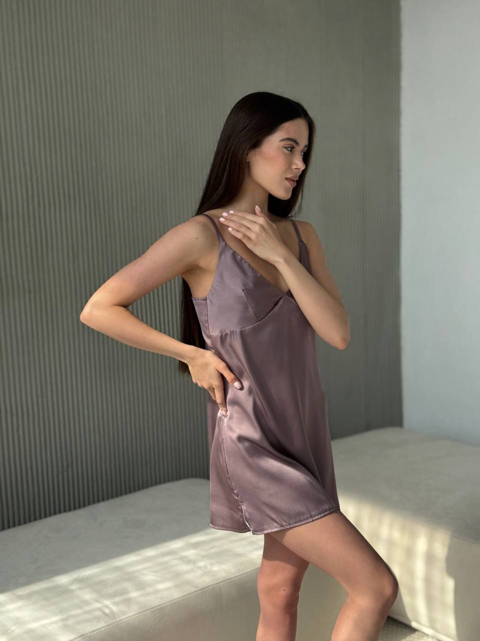 Чудова сорочка для солодкого сну. Легка, м’яка тканина з характерним благородним блиском ніжно облягає тіло, даруючи відчуття справжньої розкоші. Ідеальний вибір для дому, ранкового ритуалу або як стильний акцент у вечірньому образі.