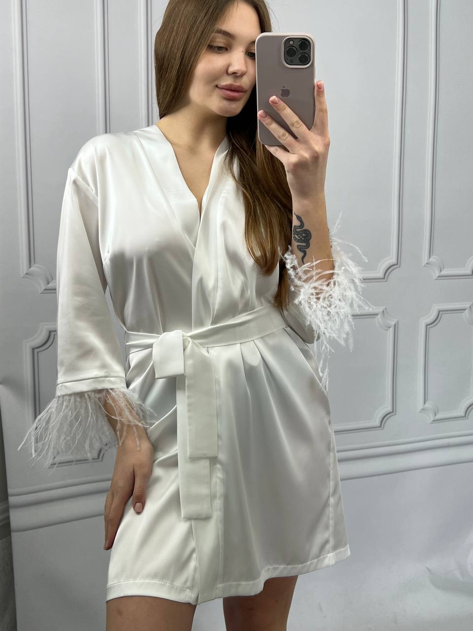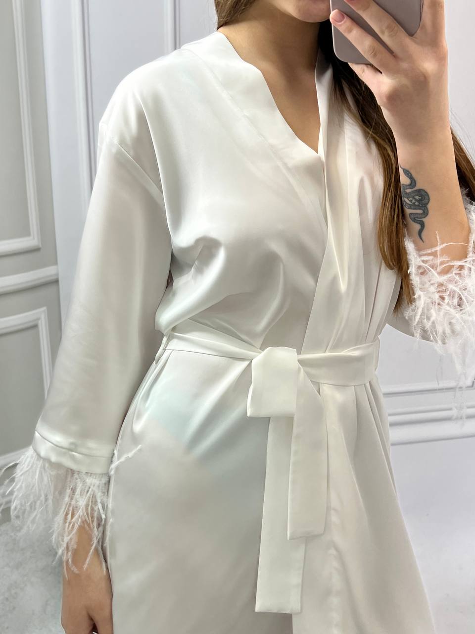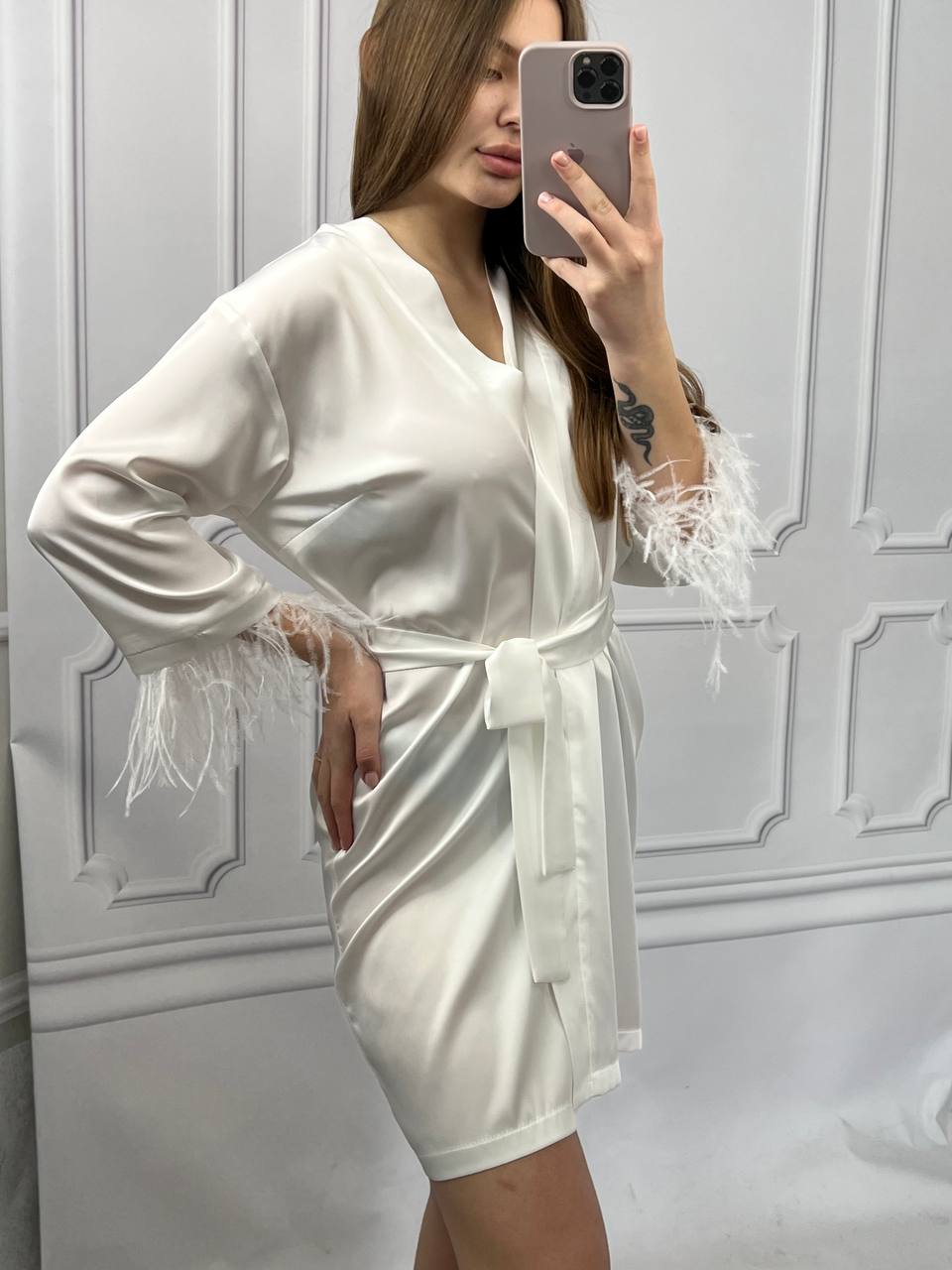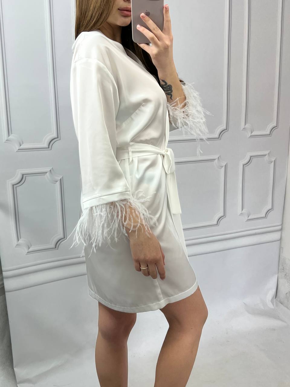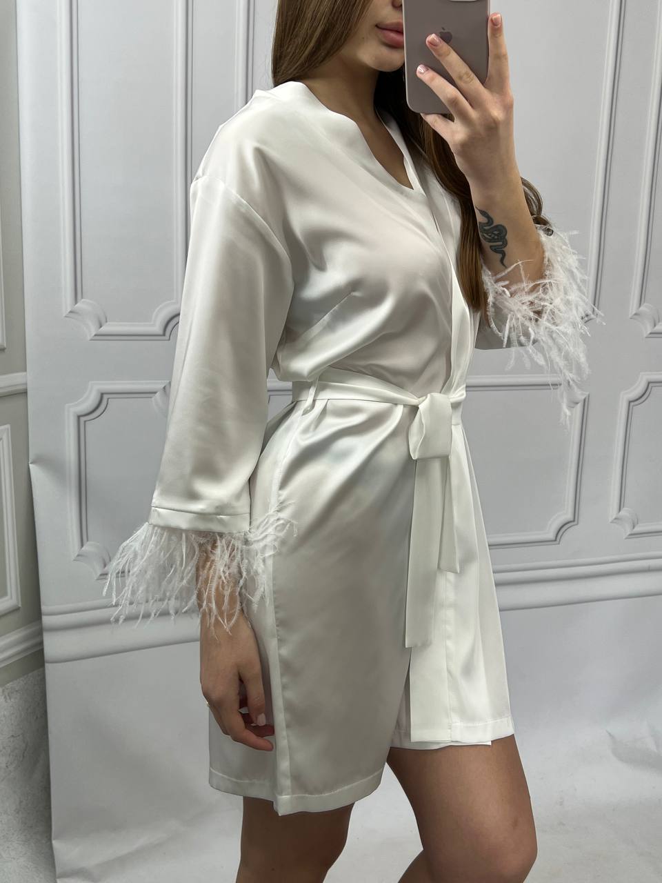 Шовковий халат з пір’ям на рукавах айворі