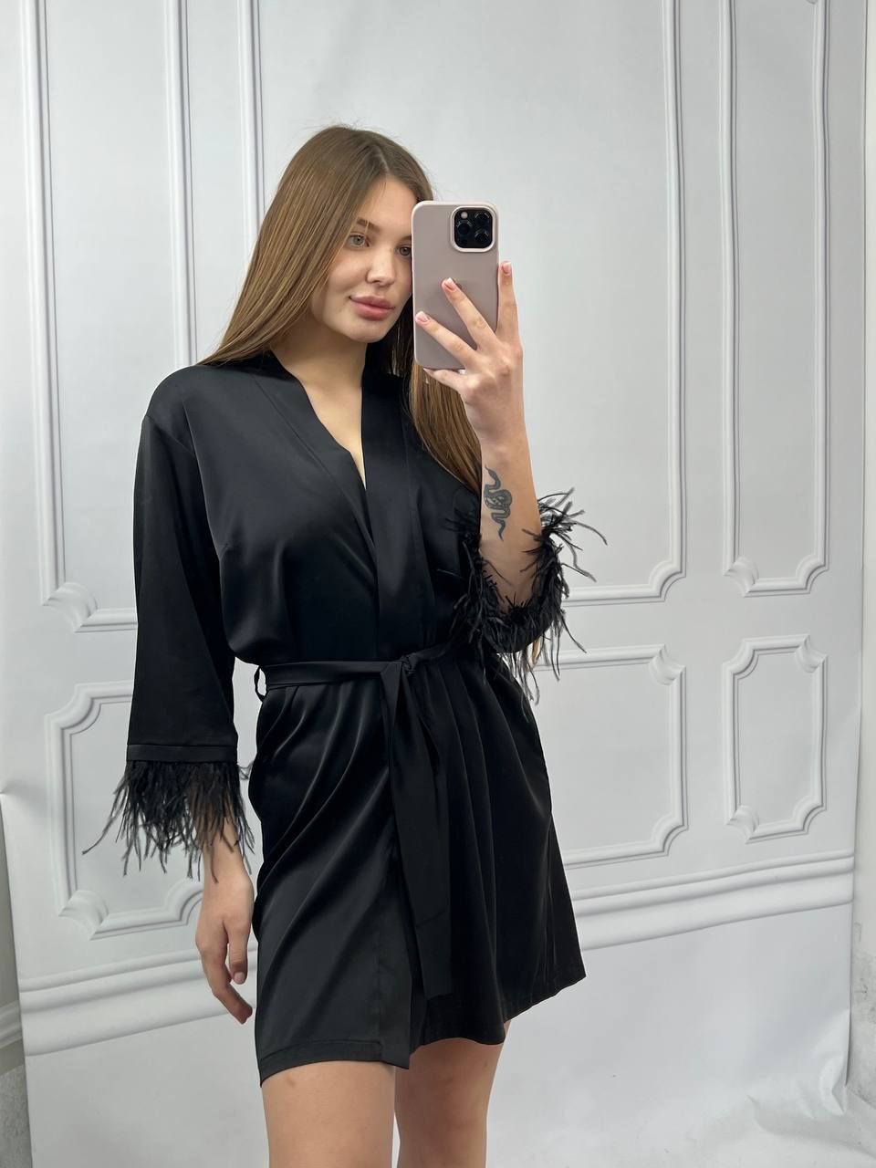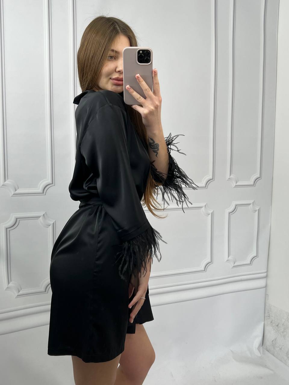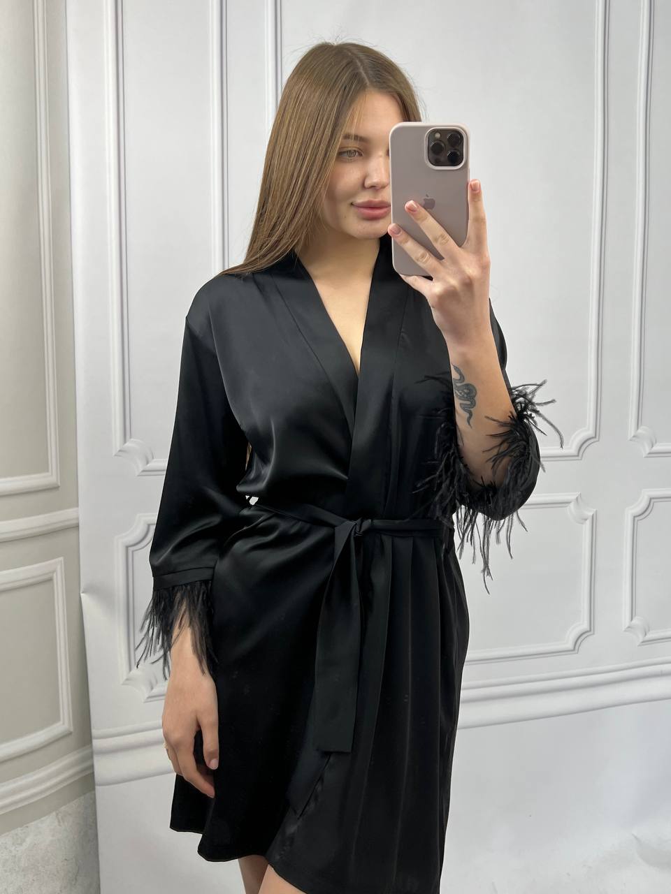 Шовковий халат з пір’ям на рукавах чорний